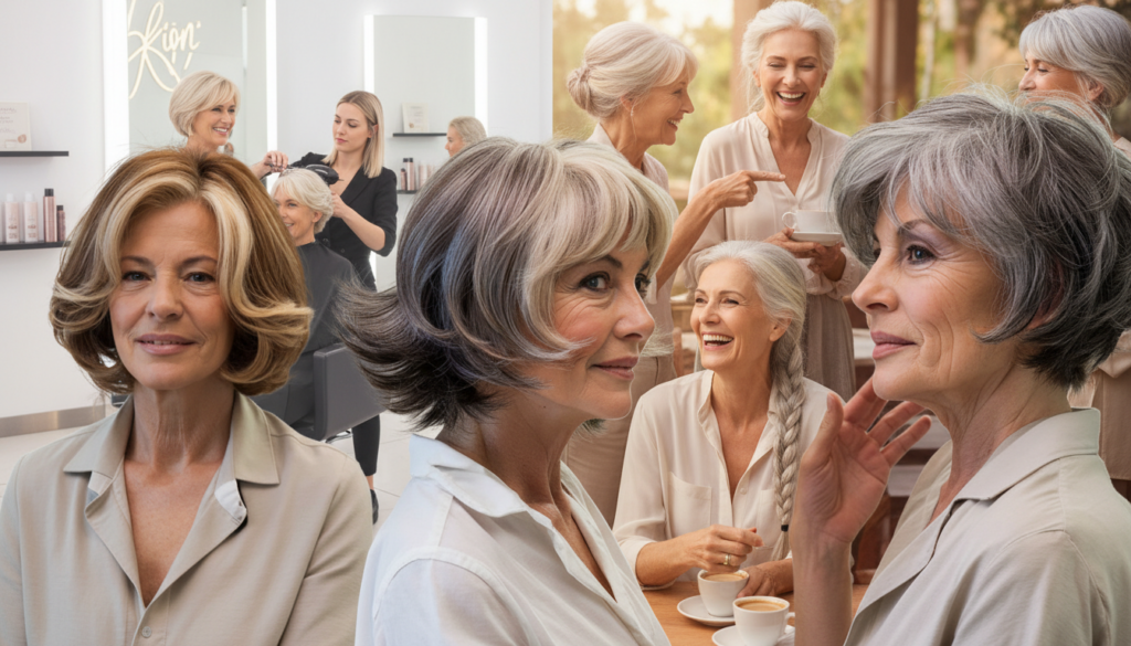 The women’s section of the salon is noisy with hair dryers and quiet with secrets. Three women in their sixties sit in black capes and talk under the buzzing fluorescent lights on a Tuesday morning, between school runs and orthopaedic appointments. One person is asking for ‘that layered bob that takes ten years off’, while another is looking through pictures of famous people with fringe and zooming in on a shiny silver pixie cut. The third person runs a hand through her thinning, completely natural hair and says, almost apologetically, “I don’t know… maybe I should do something.”